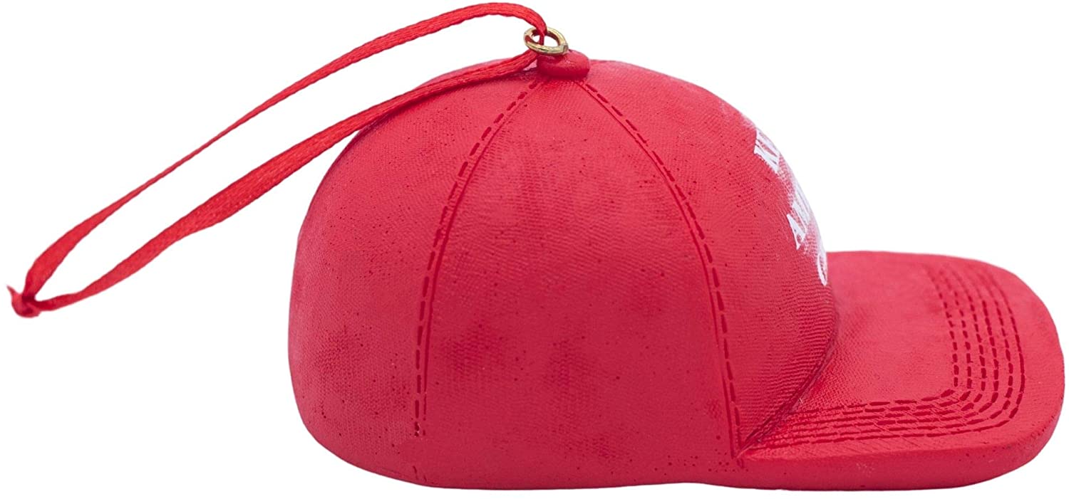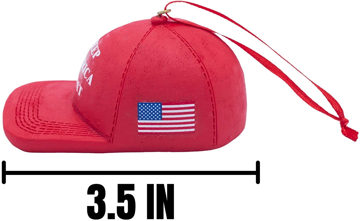 Keep America Great Red MAGA Hat Christmas Tree Ornament! Get your Donald Trump KAG Ornament for your Xmas tree this year. This beautiful ornament matches the USA "MAGA" and "Keep America Great" hats that Donald Trump wears. Add this tribute to the 45th President with this great tree ornament. Red Ribbon included. Handcrafted and painted with high quality bright colors that will pop out on the Christmas tree. Makes a great gift or stocking stuffer for any Republicans, Trump supporters, liberals and conservatives. This ornament is 3.5 in X 2.5 in X 1.5 in. Ships from the USA.
