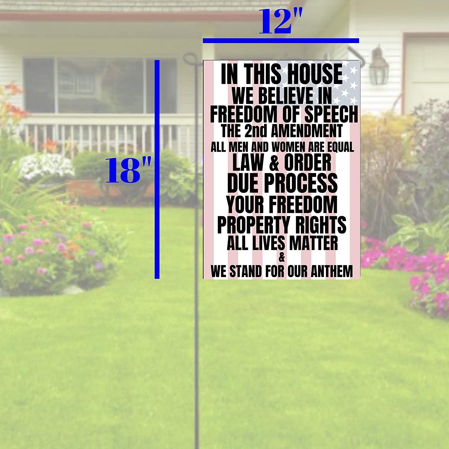 - SUPPORT- In this house we believe in the constitutional freedom garden flag. Support President Donald Trump and Mike Pence in 2020 with this great double-sided 12x18 garden flag. Fits on any standard garden flag holder